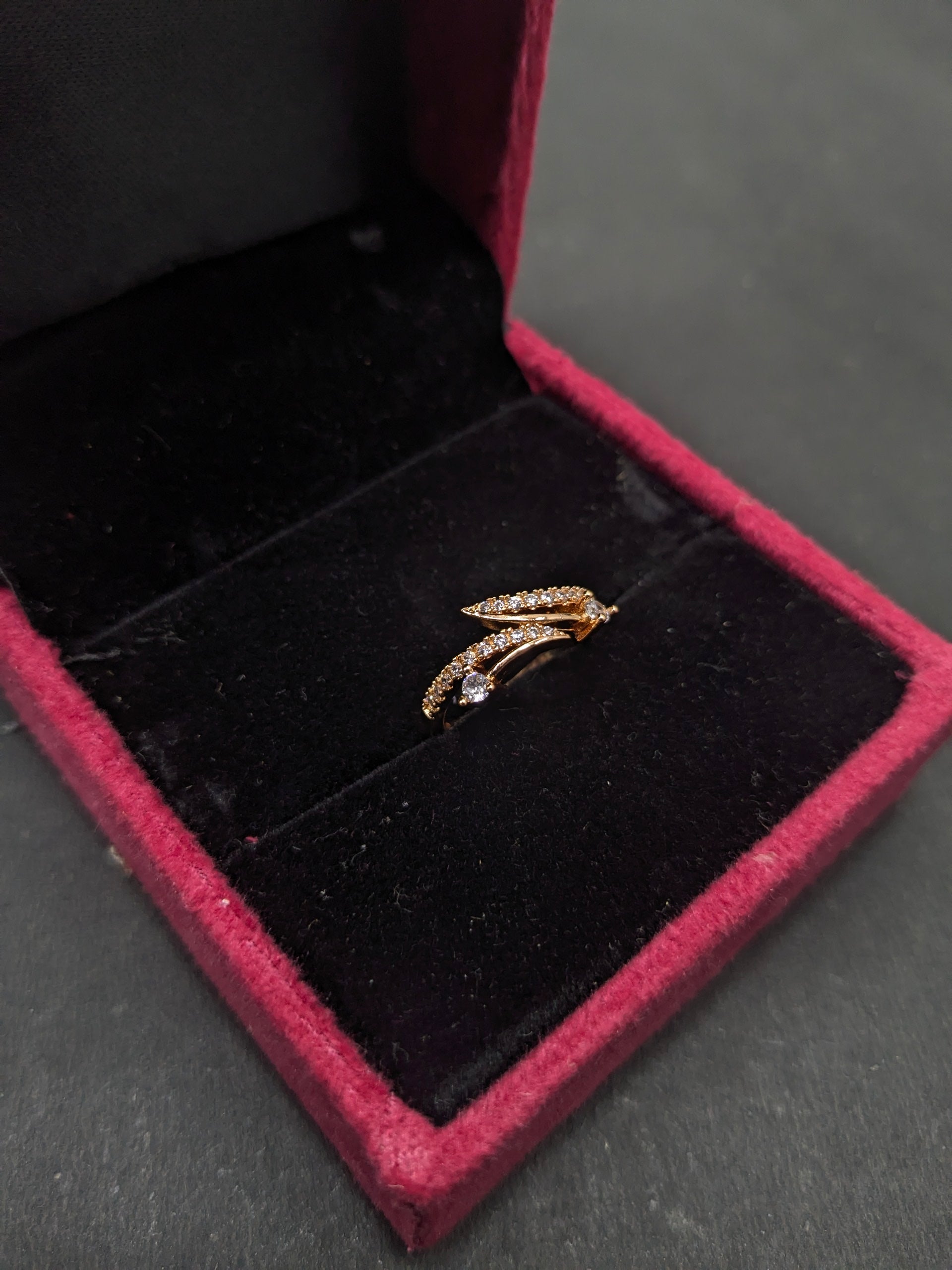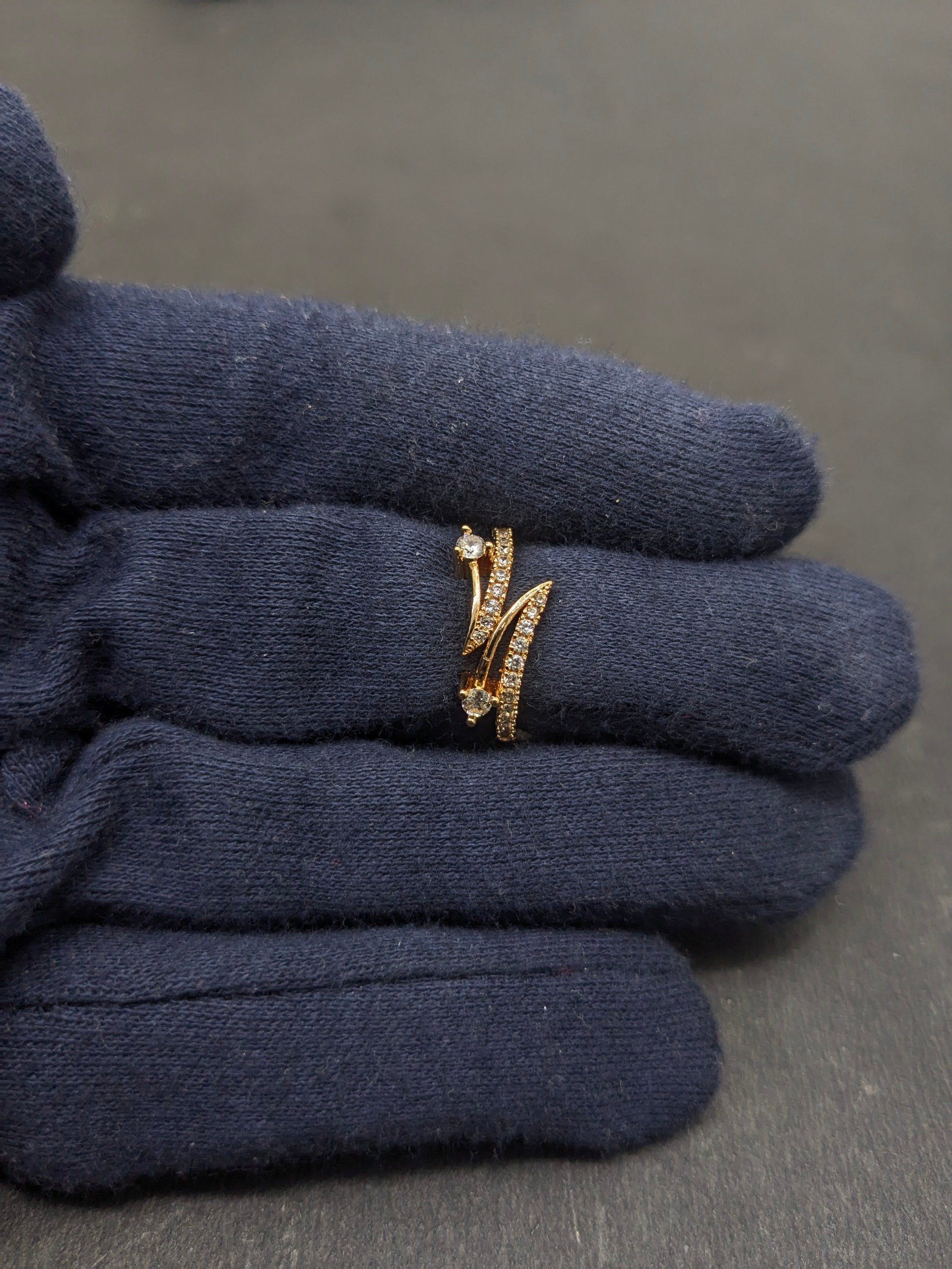 Gold-plated adjustable finger ring has white stone-studded detailing, secured with a slip-on insert