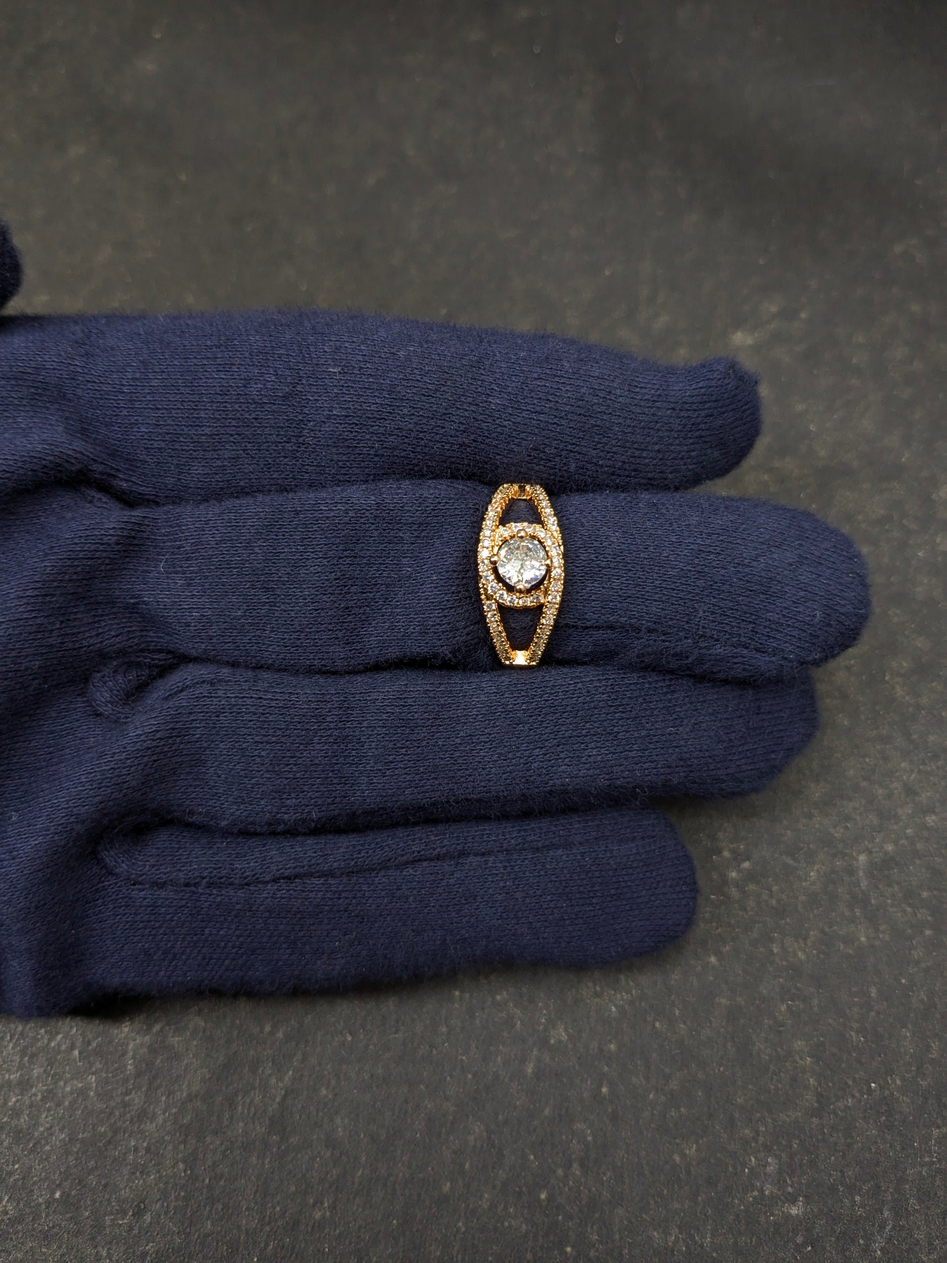 Gold-plated adjustable finger ring has white stone-studded detailing, secured with a slip-on insert
